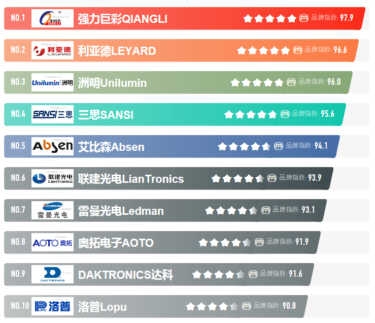 LED顯示屏十大品牌排行:強力巨彩、利亞德、洲明、上海三思、艾比森、聯(lián)建光電、雷曼光電、奧拓電子、羅普等,了解LED顯示屏十大品牌,大家可參照該排名選購,都是知名品牌、實力資力都很強,質(zhì)量靠譜、售后服務(wù)等也很完善,無需擔憂。